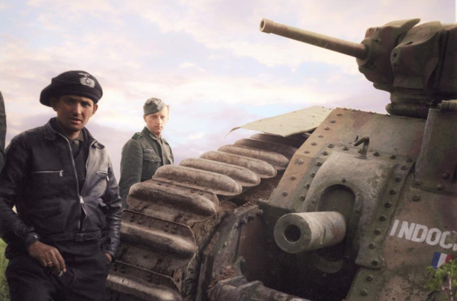Německý tankista si pořídil snímek na památku před těžkým francouzským obrněncem Char B1 Bis. I když by se mohlo zdát, jako by si svou pózou jeho vyřazení nárokoval, není tomu tak. Stroj s věžovým číslem 205 a bojovým jménem „Indočína“ náležící ke 3. rotě 15. tankového praporu totiž padl za oběť palbě vlastních vojáků.