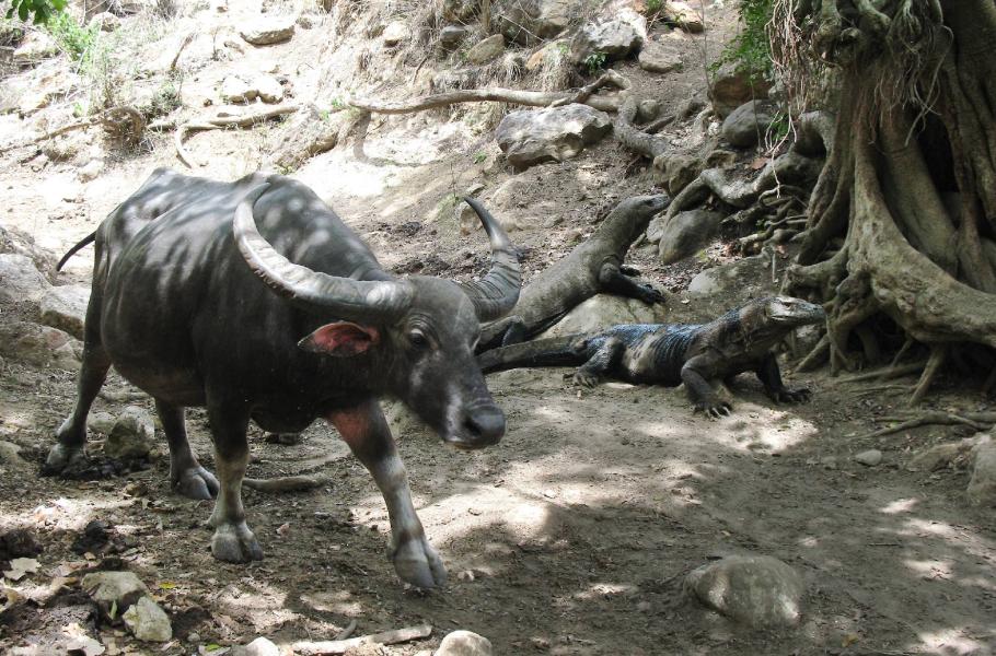 Pověst hlavního komodského útočníka má ovšem při zdejší absenci šelem někdo jiný. Všechna výše jmenovaná zvířata mají na ostrovech jediného přirozeného nepřítele – varana komodského (Varanus komodoensis). Pokud lze soudit z nevšímavých setkání s tímto až tři metry dlouhým a 70 kilogramů těžkým ještěrem, z jeho zubů paradoxně nemají strach. To může mít několik důvodů. Jednak se s obrovskými plazy potkávají každý den a drtivá většina takových setkání probíhá v čistě sousedském duchu. No a těm, kteří dosud „komodským drakem“ nebyli napadeni, pravděpodobně chybí přímá souvislost mezi kousanci svých přátel a příbuzných a uhynutím. Vždyť mezi oběma událostmi může uběhnout i dvoutýdenní perioda.