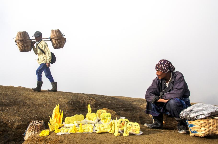 Dole v kráteru ovšem také vyvěrá síra, pro kterou se trmácejí místní horníci. „Turistům vstup zakázán“, informuje nás rezavá cedule na okraji srázu. Většina návštěvníků se v tomto místě zastavuje. Muži s prázdnými koši však pokračují dál, stezkou dolů. Vydávám se za nimi. Strmá cesta vytesaná do kamene směřuje na dno kráteru – k místu, kde vyvěrá roztavená síra. Ztuhlý materiál pak horníci lámou pomocí kovových tyčí a v dřevěných koších ho vynášejí ven. Veškerá práce probíhá ručně a náklad na zádech obvykle váží 70–90 kg.
