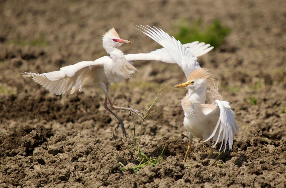 Čerstvě zoraná půda byla neodolatelným lákadlem pro malé volavky rusohlavé. Červenavý zobák jedince vlevo je součástí svatebního šatu