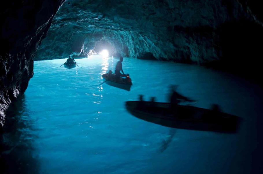 Vchod měří na výšku pouze metr, takže je nutné se sklonit. Pak vás ale uvítá zářivě modré světlo, jakoby prostupující z vody i skrze vás, a při zpěvu kapitánů si tak budete připadat jako v úplně jiném světě. „Efekt modré barvy vzniká díky světlu, které do jeskyně vniká druhým otvorem, pod hladinou. Je asi desetkrát větší než používaný vchod. Podloží je navíc vápencové, takže se od něj světlo v průzračné vodě krásně odráží,“ vypráví průvodce Guiseppe Ruggiero a doplňuje, že pro turisty je jeskyně otevřena už 150 let.