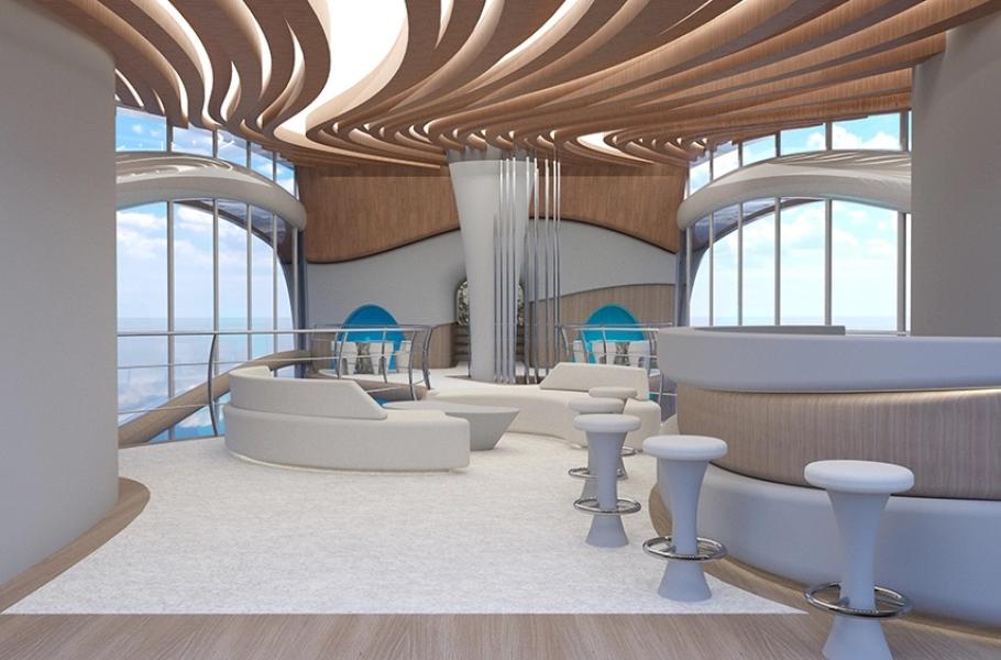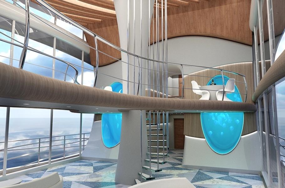 Koncept kombinuje minimalistický design a výrazné motivy „vzdouvání“, inspirované pohybem vln. Zakřivené linie, připomínající vlny oceánu, jsou přítomné nejen v křivkách lodi, ale i v interiéru a společně s modrými tóny a velkými skleněnými okny navozují pocit „všudypřítomnosti nekonečného obzoru“. Součástí lodi je i dvoudílné akvárium pro medúzy.
