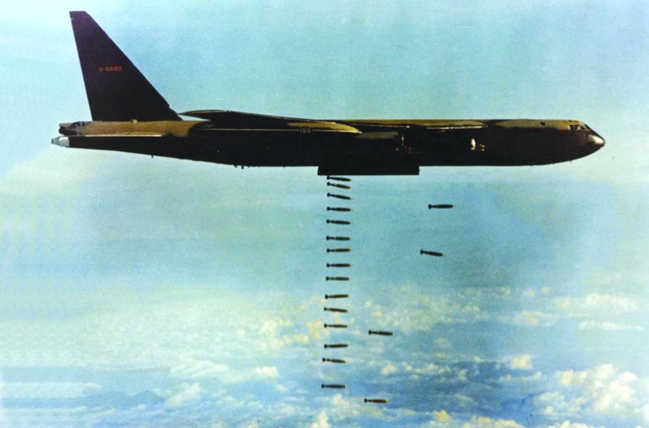 Boeing B-52D amerického letectva shazující bomby nad Vietnamem. Toto letadlo absolvovalo svou poslední bojovou misi 29. prosince 1972 a bylo jedním ze tří posledních letounů B-52, které bombardovaly Severní Vietnam během „Operace Linebacker II“.