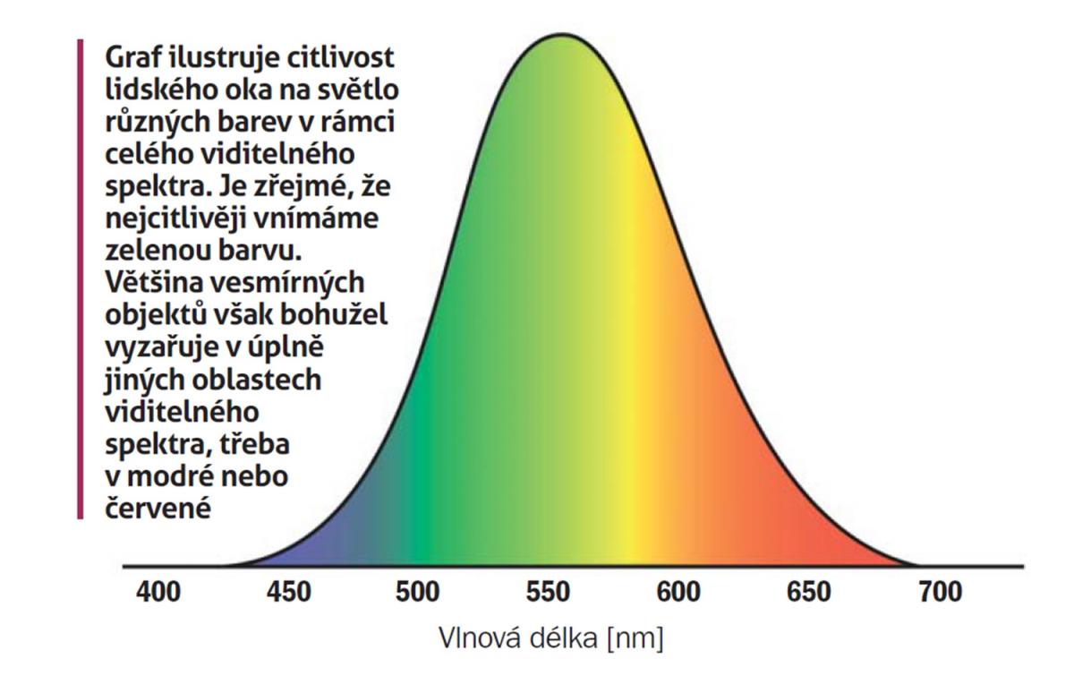 Další rozdíl spočívá v citlivosti našeho oka a klasického filmu či digitálního obrazového čipu. Oči dokážou vnímat pouze tzv. viditelné světlo v určitém rozsahu vlnových délek (barev). Nejcitlivější jsou na světlo žluté a zelené, zatímco nejméně vnímají to červené. Jenže například mnohé mlhoviny vyzařují zejména v červené oblasti elektromagnetického spektra. Je tudíž jasné, že běžně z nich mnoho neuvidíme. Při nízké intenzitě světla navíc přicházíme o barevné vidění úplně. Naopak filmy a snímací čipy mají mnohem větší citlivost, a mohou jít dokonce až za hranice viditelného záření. S astrofotografií však začneme tam, kde bude světla dostatek – aby si přišli na své i majitelé nejjednodušších digitálních fotoaparátů, a dokonce i mobilních telefonů. Příště se proto zaměříme na tzv. afokální fotografii. (vychází v sobotu 18. dubna)