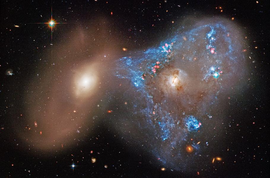 Interagující galaktické duo Arp 143 zahrnuje narušenou spirální galaxii NGC 2445 (vpravo) a její méně jasný protějšek NGC 2444. (foto: NASA, ESA, STScI, J. Dalcanton, CC BY-SA 4.0)
