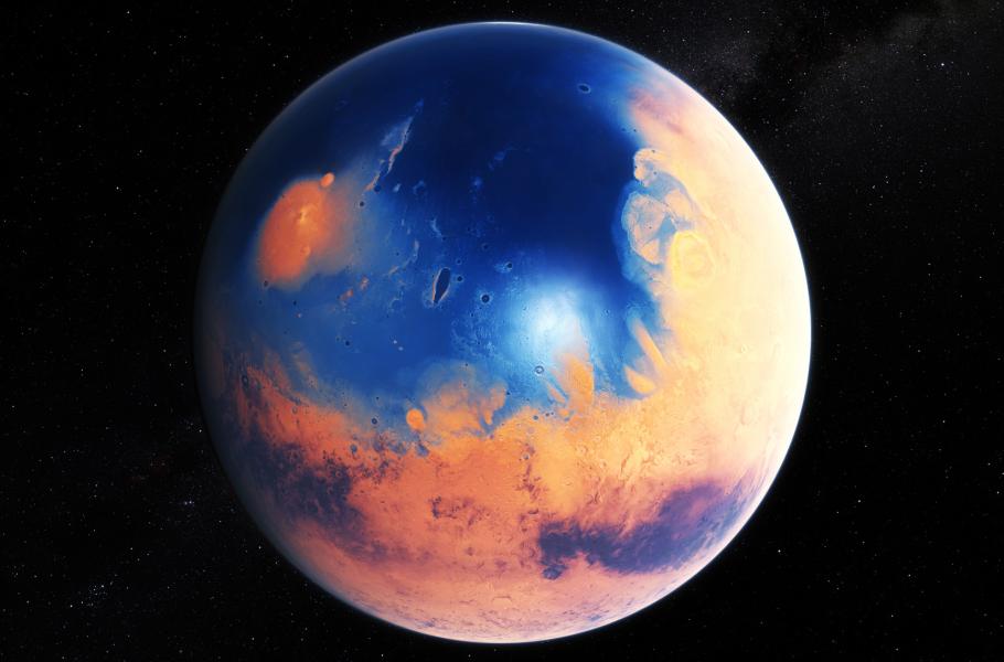 Ilustrace zachycující představu Marsu v období před 4 miliardami let. Na Marsu mohlo být v té době dostatečné množství vody ke vzniku globálního oceánu s hloubkou až 140 m. Je však pravděpodobnější, že kapalina stékala do níže položených oblastí, čímž vznikla nádrž s rozlohou poloviny severní marsovské hemisféry, jejíž hloubka v některých místech dosahovala až 1,6 km. (zdroj: ESO, M. Kornmesser, N. Risinger, CC BY-SA 4.0)