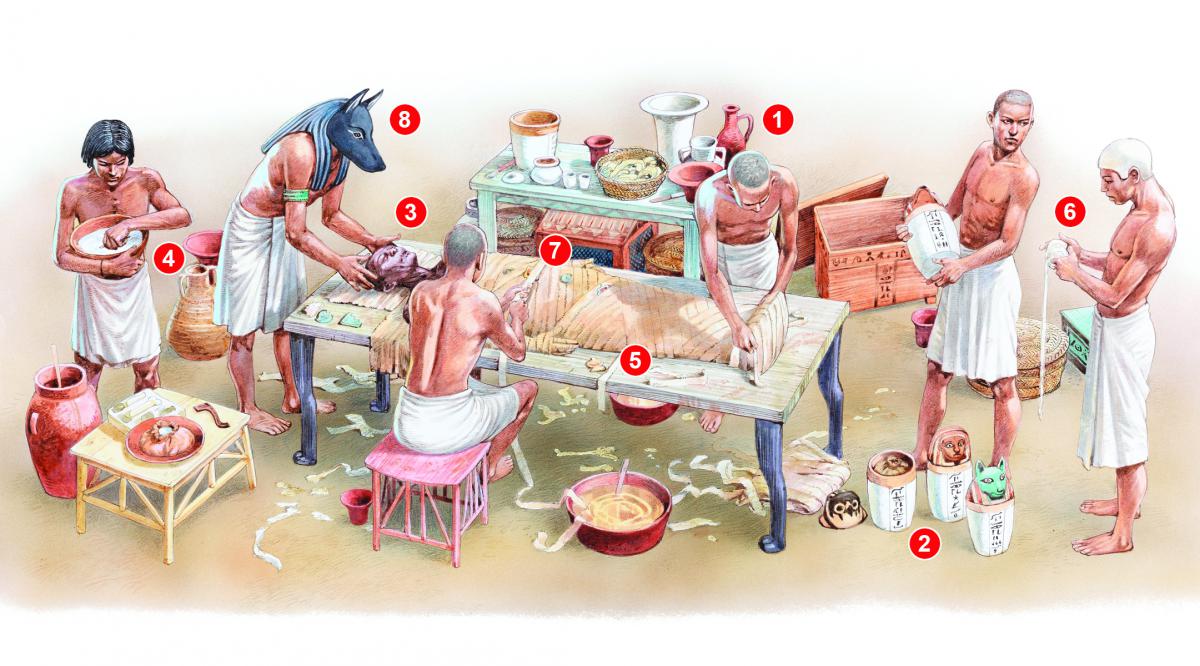 Po smrti se tělo odneslo na „místo očišťování“ zvané ibu, kde se umylo ve vodě z řeky. Poté se přeneslo do per nefer, tedy „balzamovacího domu“, což byl otevřený stan, který se dal větrat. Zde se tělo položilo na stůl, aby balzamovači mohli provést pitvu. Jednalo se o kvalifikované pracovníky s rozsáhlými znalostmi anatomie a s pevnou rukou. Často byli zároveň kněžími, protože důležitou součást mumifikace tvořilo provádění náboženských rituálů nad zemřelým. Nejzkušenější kněz vykonával hlavní části balzamovacího procesu a nosil přitom šakalí masku. To mělo symbolizovat přítomnost Anupa – boha balzamování a posmrtného života – během mumifikace.