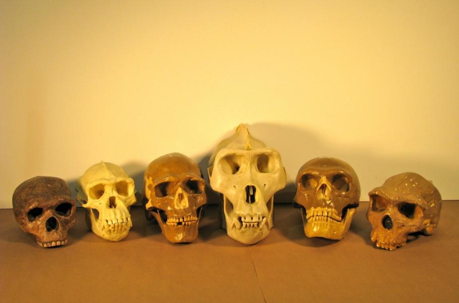 Na snímky jsou lebky šimpanze, gorily, člověka a tří vymřelých příbuzných z lidské linie