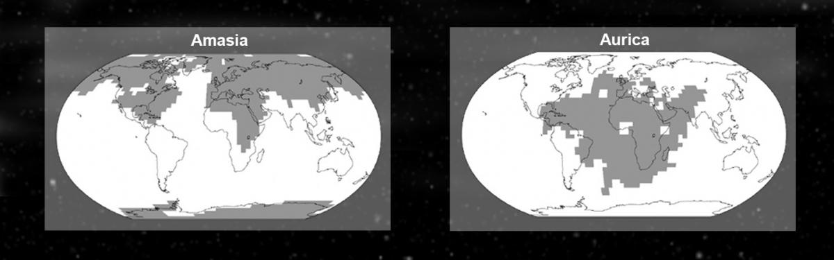 Simulace dvou superkontinentů budoucnosti. (ilustrace: NASA GISS, Michael Way, CC BY 4.0)