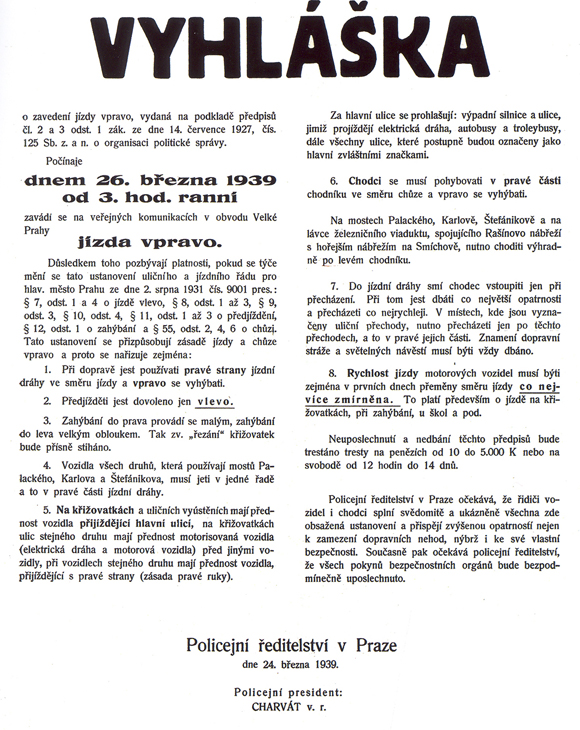 Už v březnu 1939 byla novinka zavedena ve většině měst, vyjma Prahy. Tady se nařízení o dva týdny posunulo, aby bylo možno alespoň náznakem plynulý chod dopravy zajistit. Cedule na příjezdu do hlavního města upozorňovaly na jízdu vlevo, mnozí se tím ale neřídili, a tak na silnicích vládl několik týdnů chaos. Ani obří nápisy: „jezdí se vpravo!“ nedokázaly zabránit četným nehodám a srážkám.