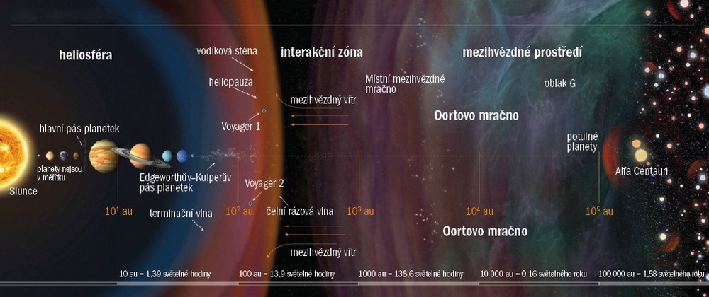Vliv slunečního větru pak vymezuje oblast tzv. heliosféry, pomyslné bubliny, v níž dominují nabité částice s původem ve Slunci. Její hranice leží asi 120 AU od naší hvězdy a sondy Voyager 1 a 2 už ji překonaly.