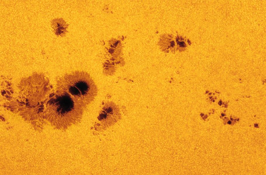 Sluneční skvrny představují oblasti velmi silného magnetického pole pozorované ve fotosféře naší hvězdy. Vnímáme je jako tmavé, neboť jsou chladnější než okolí, s teplotou v temném jádře – tzv. umbře – kolem 4 500 °C. Magnetické pole totiž omezuje „dodávky“ tepla z horkého nitra.