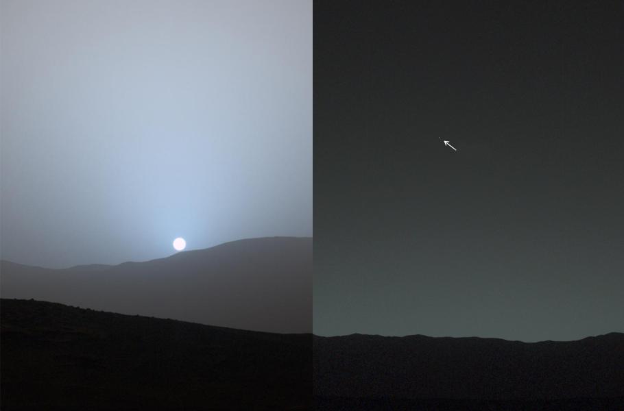 Vlevo západ slunce nad marsovským kráterem Gale, jak jej zachytil rover Curiosity. Vpravo snímek Země z povrchu rudé planety opět okem roveru Curiosity.
