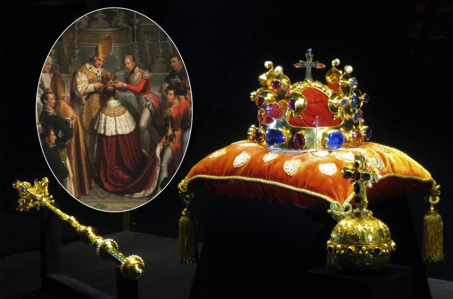 Ve výřezu korunovace císaře Ferdinanda I. českým králem v chrámu svatého Víta v Praze v roce 1836.