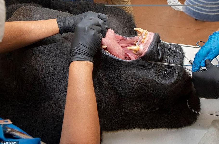 Stomatologické zákroky u zvířat trvají podle závažnosti od dvou do osmi hodin a probíhají v celkové narkóze. Podle mluvčího miamské zoo Rona Magilla se ještě nestalo, aby se některý z pacientů během zákroku vzbudil. Na snímku 27letý gorilí samec Barney.