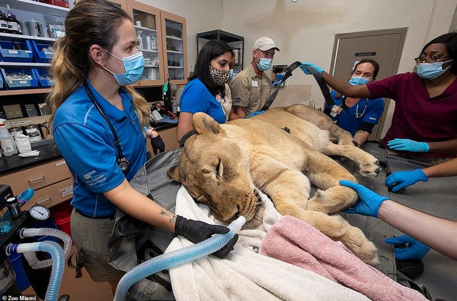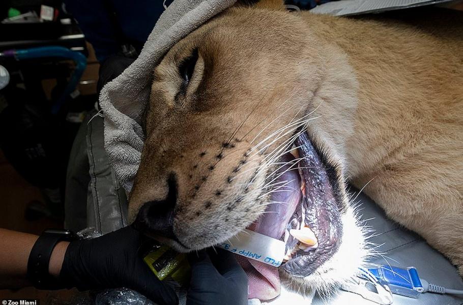 Během výkonu jsou zvířata monitorována anesteziologickým týmem, a pokud se u nich objeví známky probouzení, lékaři ihned zasáhnou. Na snímku desetiletá lvice Kashifa, které musela doktorka Berningová zub vytrhnout.