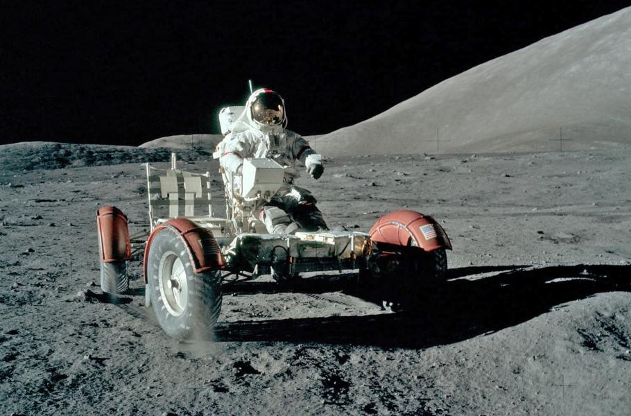 Eugene Cernan, poslední člověk na Měsíci, se prohání v lunárním roveru během mise Apollo 17.