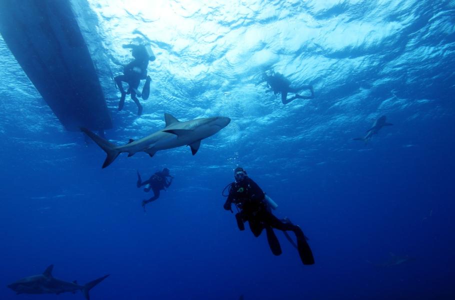 Pomalu klesáme podél naprosto neporušeného útesu do modravé hlubiny. Na hladině skoro ani vlnka, pod ní mírný proud, teplá voda a spousta korálů a hub. Ani nemusíme moc kopat ploutvemi a jen si užíváme tenhle potápěčský ráj. Voda zaslíbená to ovšem je pouze pro potápěče, kteří vyhledávají blízká setkání se žraloky. Ti jsou totiž všude kolem nás.