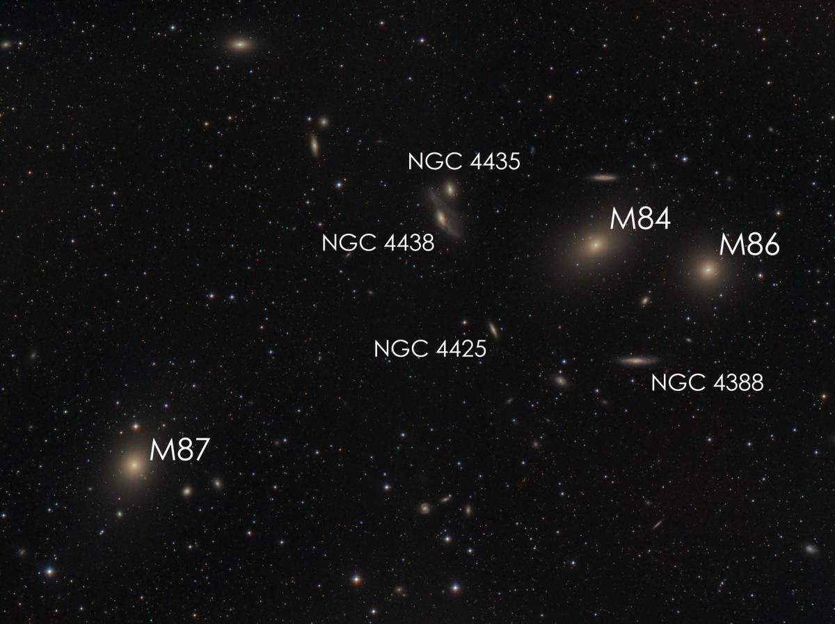 Jarnímu nebi ovšem vévodí jiná skupina objektů vzdáleného vesmíru, a sice galaxie. Ať už s dalekohledem zavítáte do Lva, Vlasů Bereniky, nebo třeba Panny, všude se to hvězdnými ostrovy přímo hemží. Aby také ne, když se na pomezí posledních dvou jmenovaných souhvězdí ukrývá pořádná galaktická kupa!