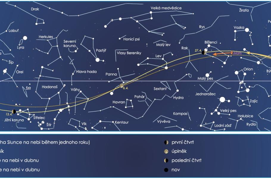 Nejinak tomu bude i letos v dubnu. Z celého roku však půjde o nejlepší možný výhled na Merkur, jaký nám příroda dopřeje. Na začátku měsíce hledejte nejmenší členku Sluneční soustavy na světlém soumrakovém nebi těsně nad západním horizontem. Den ode dne bude ovšem vidět výš, až ji 11. dubna půl hodiny po západu Slunce spatříme asi 12° nad uvedeným obzorem.