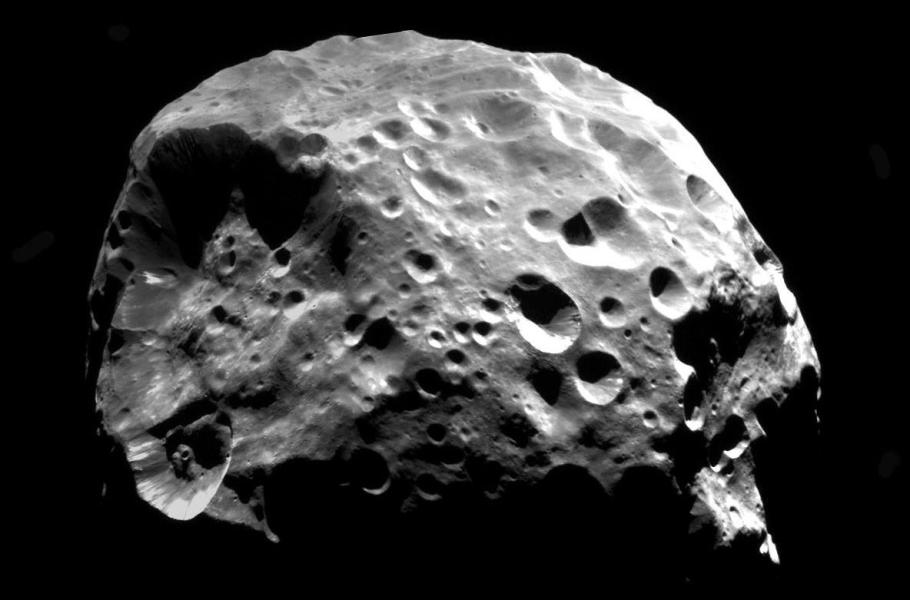 Phoebe pohledem sondy Cassini. Velmi tmavé těleso má albedo neboli míru odrazivosti povrchu 0,06, tedy méně než uhlí.