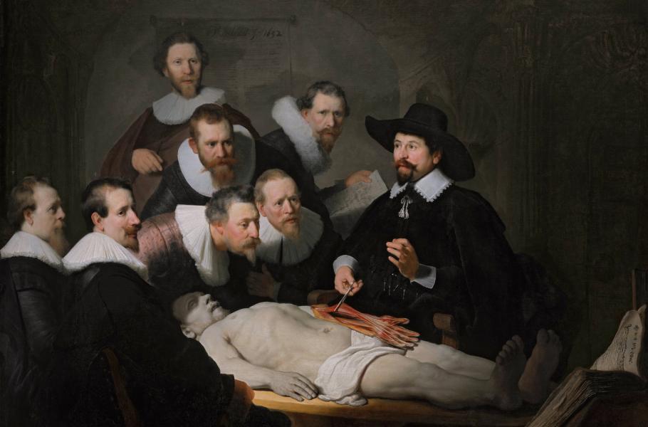 Rembrandtův obraz Anatomie doktora Tulpa, znázorňující pitvu a přednášku Nicolaese Tulpa.