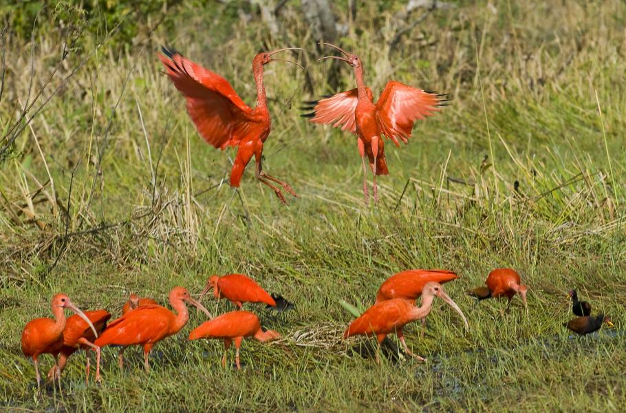 Právě v Llanos žije jeden druh, který se hluboce vtiskl do mé ornitologické duše hned od prvních dnů cest po Jižní Americe a do značné míry se pro mne stal symbolem tropické části kontinentu. Mluvím o ibisu nachovém (též ibis rudý, Eudocimus ruber), kterému kovboji v Llanos říkají corocoro colorado. Je to pták tak neobyčejný, že jsem se navzdory svému biologickému vzdělání zpočátku nemohl zbavit pocitu, že do přírody ani nepatří. Je totiž tak nápadný a nepřehlédnutelný, že si nelze neklást otázku po smyslu této podivnosti, nebo chcete-li výjimečné krásy, nad kterou se tají dech.
