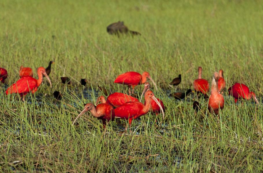 Pomalu, krok za krokem se plížíme bažinou směrem k hejnu asi třiceti rudých ibisů, v jehož středu zářivě svítí bělostný šat dvou ibisů bílých (Eudocimus albus), kteří se k hejnu připojili již včera. Během dvou či tří hodin jsme se dostali až na dvacet metrů k ptákům, kteří zcela nenuceně loví v husté podmáčené trávě. Nevěnují sebemenší pozornost ani impozantní černě zbarvené káni velké (Buteogallus urubitinga), která právě usedla na suchou větev stromu přímo nad hejnem.