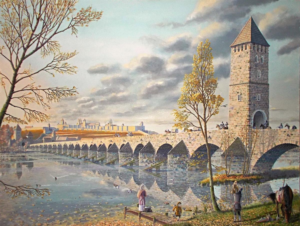 Představa Juditina mostu na obraze od Lubomíra Herce. (zdroj: Wikimedia Commons, Hooolis, CC BY-SA 4.0)