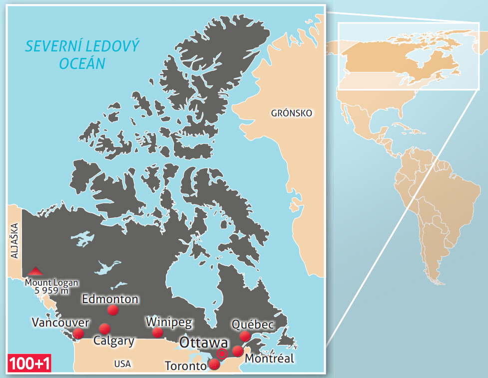 Rozloha: 9 984 670 km2, po Rusku 2. největší země světa, jen o málo větší než USA; Hranice: pouze s USA – 8 893 km včetně hranice s Aljaškou; Délka pobřeží: 202 080 km; Podnebí: na jihu mírné, na severu subarktické až arktické; Průměrné měsíční teploty (°C): Ottawa/Vancouver/Iqaluit – leden–březen -2 až -10/3–6/-23 až -26, duben–červen 6–18/9–15/-14–3, červenec–září 15–21/14–17/2–8, říjen–prosinec -6–8/4–10/-21 až -4; Průměrné měsíční srážky (mm): Ottawa/Vancouver/Iqaluit – leden–březen 50–57/109–150/19–22, duben–červen 65–84/46–75/28–37, červenec–září 84–88/36–64/52–64, říjen–prosinec 73–81/115–179/20–42; Nejnižší a nejvyšší bod: Atlantský oceán 0 m / Mount Logan 5 959 m