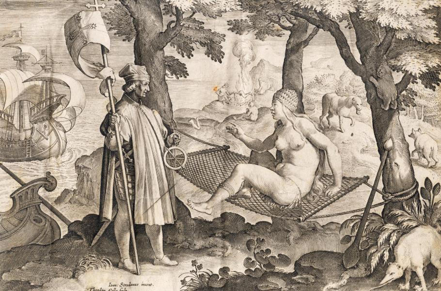 Amerigo Vespucci probouzí „Ameriku“ na Stradanově rytině (cca 1638). Vyobrazení doprovázel nápis, jehož volný překlad zní: „Amerigo objevuje Ameriku, jednou tak nazvaná, bude už navždy probuzená“. (ilustrace: Wikimedia Commons, Jan Galle Stradanus, CC0)