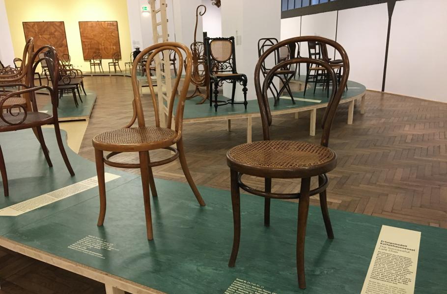 Židle z ohýbaného dřeva vynalezl a poprvé velkosériově vyráběl Michael Thonet z Boppardu v Porýní. Jeho technologie spočívala v napařování masivní bukové tyče, která se svěrkami připevnila k formě, okolo níž se měla ohýbat. Zároveň se k tyči upevnil ocelový pás, který se pak manuálně ohýbal spolu s ní. U nábytku se tak podařilo dosáhnout do té doby nepředstavitelných tvarů, stejně jako rovnoměrného ohybu.
