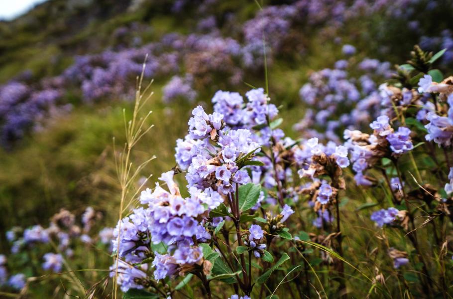 Vzácné keříky Strobilanthes kunthiana se vyskytují pouze na jihu Indie, kde porůstají svahy pohoří Nílgiri. V nadmořských výškách až 2 400 metrů kvetou jednou za dvanáct let a naposledy se vrcholy do modrofialových odstínů zbarvily v roce 2018. Další květenství tak zůstává v nedohlednu. (foto: Shutterstock)