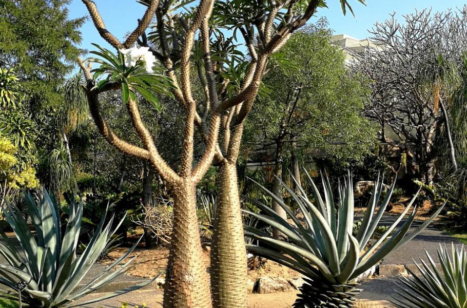 Ačkoliv se jedná o sukulent, řada prodejců i pěstitelů jej označuje za palmu – listy pachypodia madagaskarského totiž vyrůstají pouze z horní části rostliny, která tak zmíněné dřeviny skutečně připomíná. Její tělo však pokrývají až šesticentimetrové ostny, a jakmile rozkvete, provoní bílé květy široké okolí. (foto: Shutterstock)