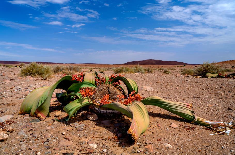 Extrémně vytrvalá welwitschie podivná se usídlila v nehostinných podmínkách pouště Namib. Věk jednotlivých rostlin se určuje těžko, nicméně podle předpokladů jsou některé z nich starší než tisíc let. Ačkoliv tedy mohou kvést i jednou za čtyřicet roků, v jejich životním cyklu nejde o jedinečnou událost. (foto: Shutterstock)