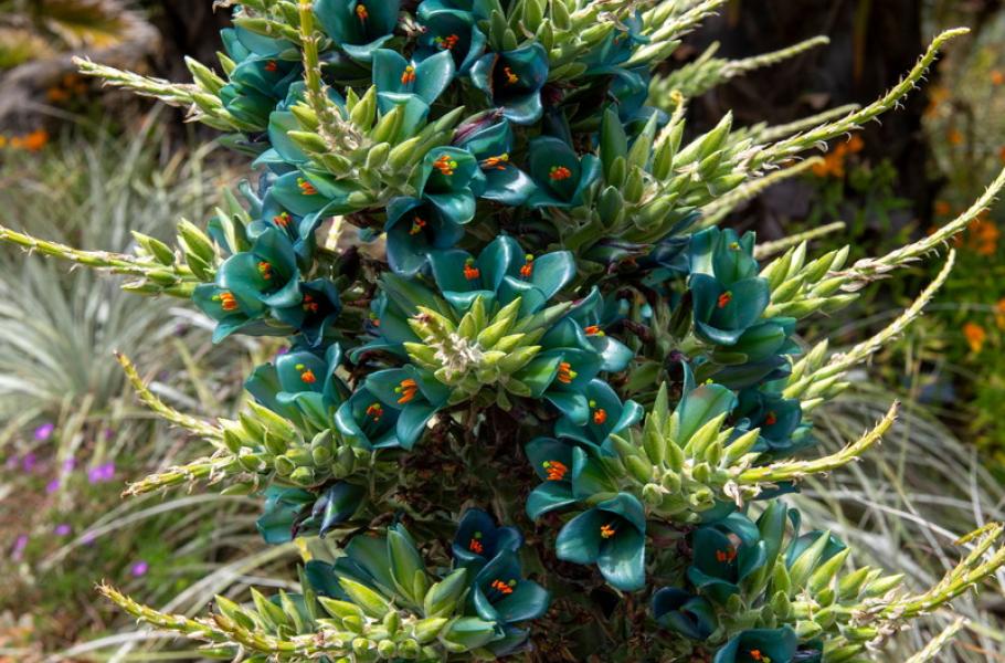 Přírodní hybrid mezi Puya alpestris a Puya venusta roste pouze v Chile a dosahuje výšky až 4,6 metru. Listy svým tvarem připomínají ostny, a jakmile rostlina vykvete, zbarví se do zelenomodra. (foto: Shutterstock)