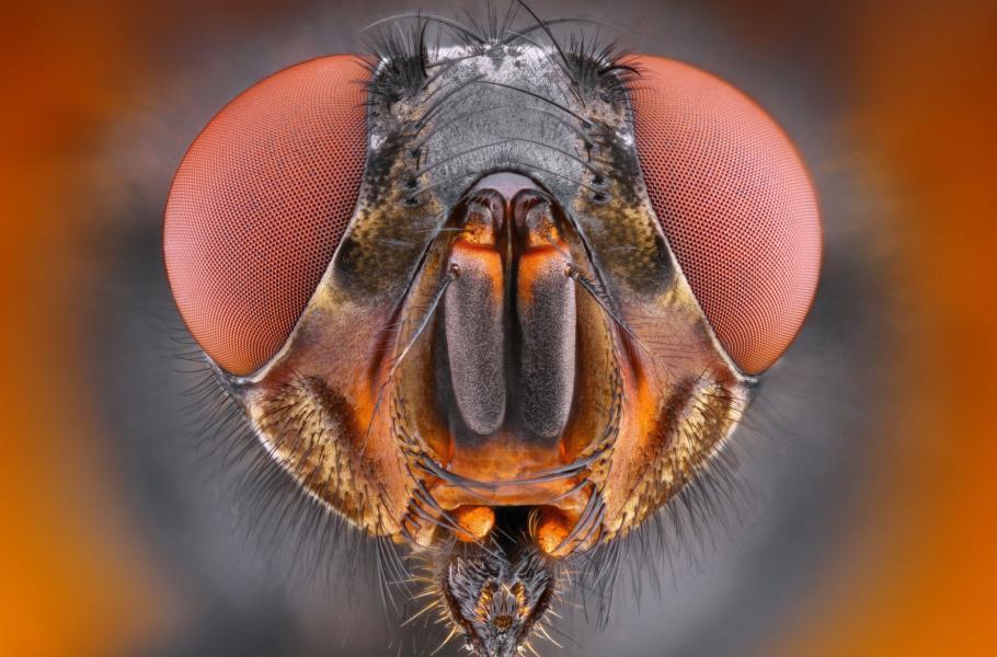 Nesmíme zapomenout na nejpočetnější skupinu živočichů, tedy členovce. V souvislosti s nimi proto připomínáme ještě jednu zrakovou kuriozitu, jíž je nejlepší detektor pohybu – složené oči hmyzu. Oči poskládané z až tisíců drobných omatidií sice neposkytují ostrý obraz, ale dokážou skvěle zaznamenat rychlý pohyb v širokém okolí. Díky tomu mají například mouchy dokonalý přehled a zaregistrují okamžitě jakýkoli svižný pohyb. Právě proto tak často unikají našim plácačkám… (foto: Shutterstock)