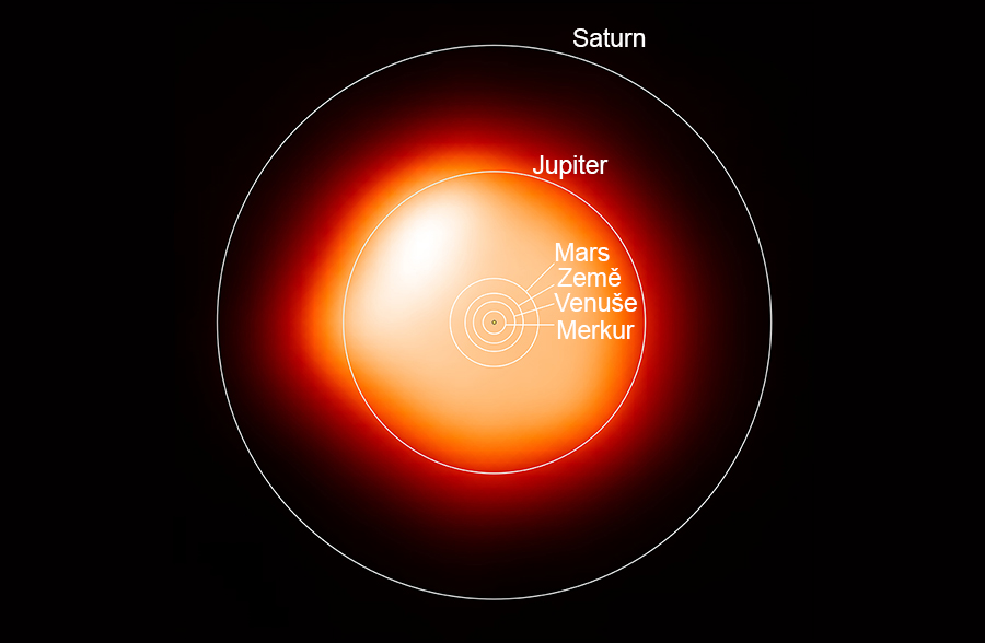 Srovnání rozměrů Betelgeuze a Sluneční soustavy. Snímek hvězdy pořídil teleskop ALMA neboli Atacama Large Millimeter Array. Vědci Australské národní univerzity ale považují takto uváděnou velikost za poněkud nadsazenou. (foto: ALMA, E. O’Gorman, P. Kervella, CC BY-SA 4.0)