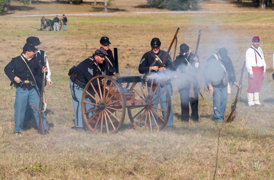 Američtí reenactoři předvádějí střelbu s původním Gatlingovým kulometem. (foto: Shutterstock)