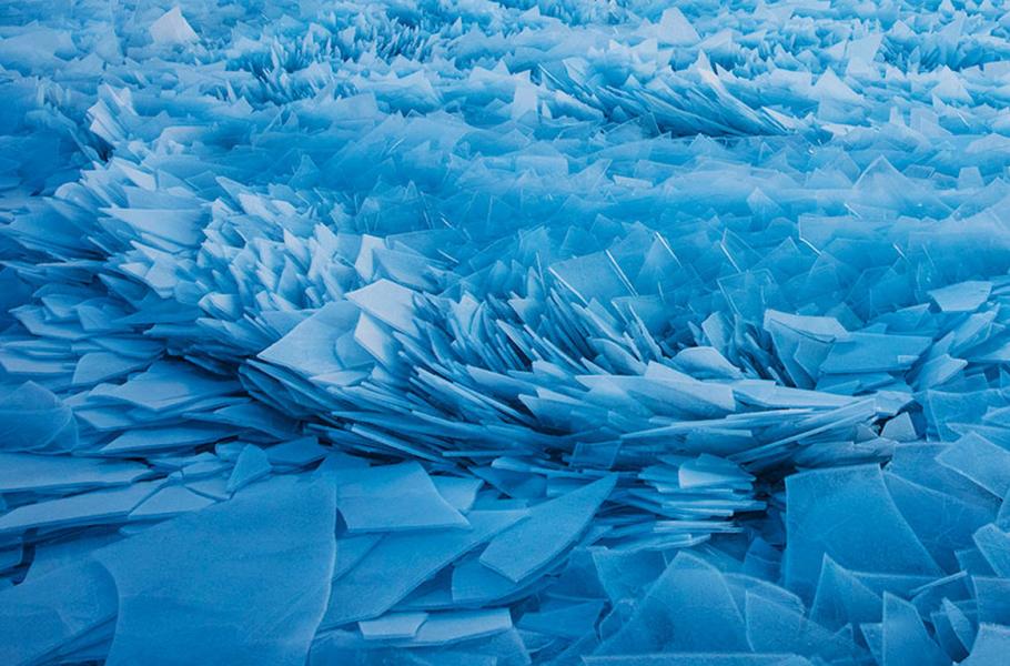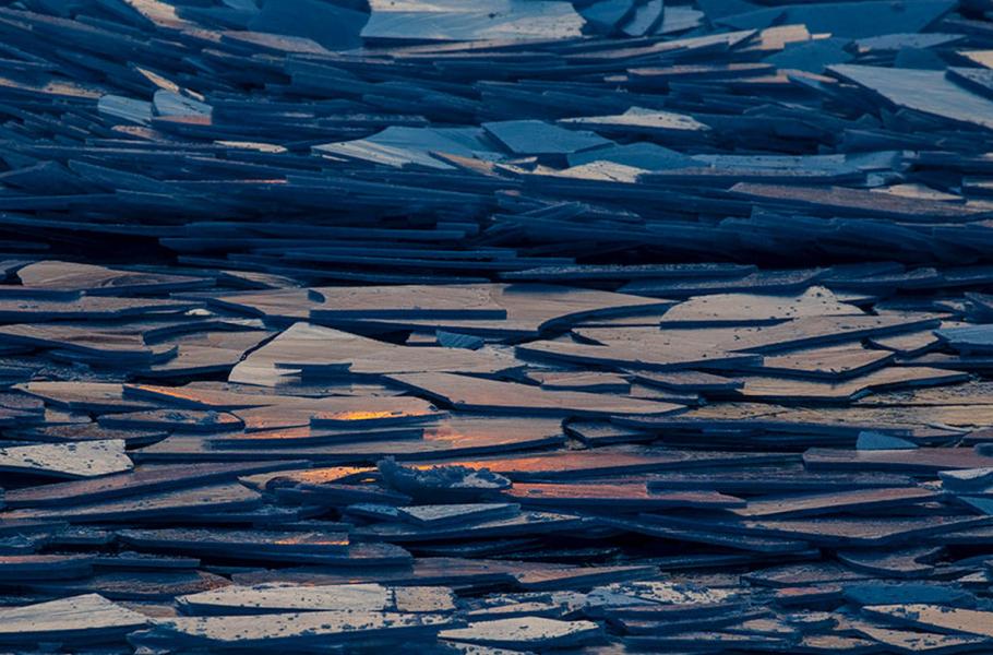 Pohybující se voda pod ledem tlačí ledové pláty na povrch a rozbíjí je na fascinující vzory.