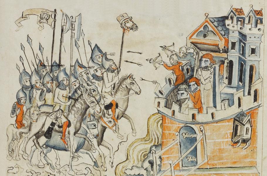 Tatarské nájezdy ve 13. století daly vzniknout mnoha legendám. Ilustrace z roku 1353 zobrazuje Tatary s Jindřichovou hlavou před lehnickým hradem. (ilustrace: Wikimedia Commons, PDM 1.0)