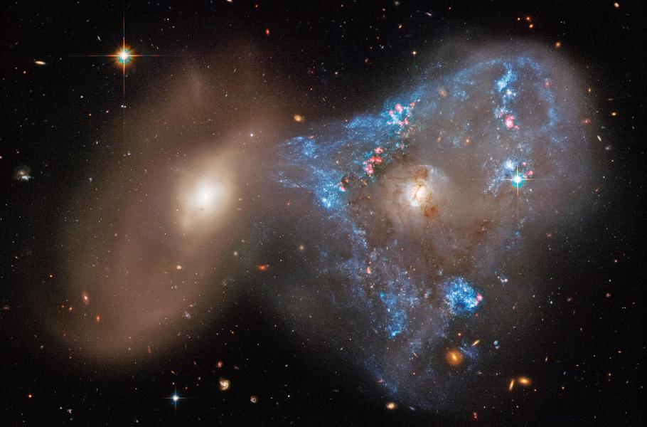 Velkolepá čelní srážka dvou galaxií podnítila neobvyklou tvorbu hvězd vytvářející modrý trojúhelník, jak ji zachytil snímek z Hubbleova teleskopu. Dvojice interagujících ostrovů se souhrnně nazývá Arp 143, přičemž zahrnuje zdeformovanou hvězdotvornou spirálu NGC 2445 (vpravo) a její méně okázalou společnici NGC 2444. Astronomové naznačují, že se při jejich míjení zažehlo jedinečné formování stálic v první zmíněné galaxii – je totiž bohatá na plyn, z něhož se nové hvězdy tvoří. (foto: NASA, ESA, STScI, J. Dalcanton, CC BY-SA 4.0)