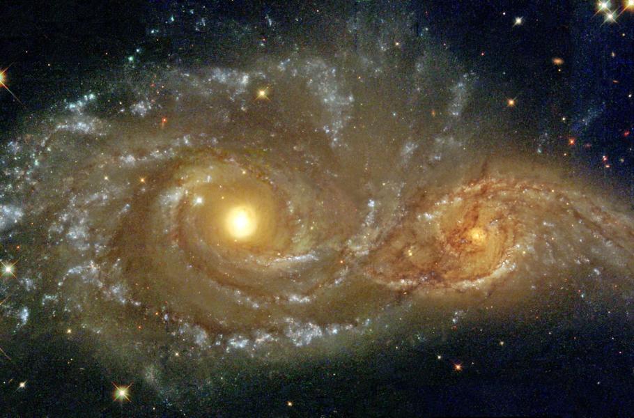 Kolidující spirální galaxie NGC 2207 a IC 2163 jsou od nás vzdálené asi 80 milionů světelných roků a jejich poloha se promítá do souhvězdí Velkého psa. V roce 1835 je objevil astronom John Herschel: Větší z nich se klasifikuje jako přechodná spirální galaxie se slabou vnitřní prstencovou strukturou kolem centrální příčky, zatímco menší spirála s příčkou má protáhlé rameno, které pravděpodobně natahují slapové síly její společnice. Oba ostrovy obsahují obrovské množství prachu a plynu a vykazují zvýšenou rychlost hvězdotvorby. (foto: NASA/ESA, CC BY-SA 4.0)