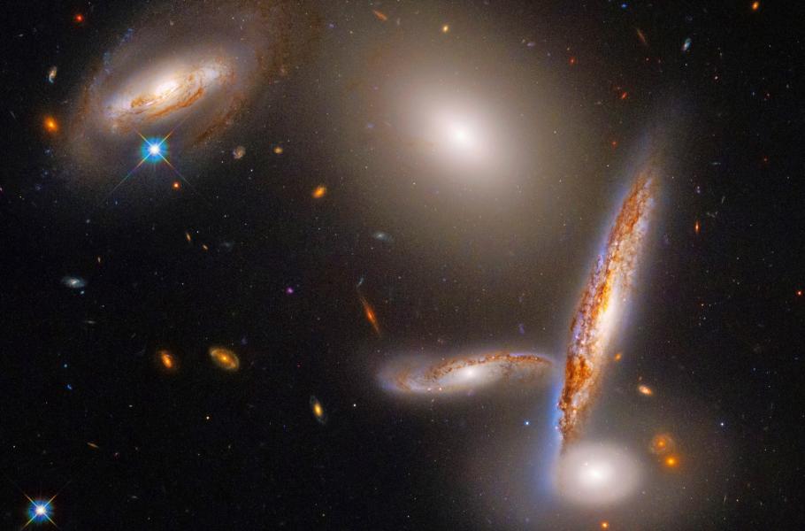 Malá galaktická skupina pojmenovaná Hickson Compact Group 40 se promítá do souhvězdí Hydry a obsahuje tři spirální galaxie, jednu eliptickou a jednu čočkovou. Hubbleův teleskop je zachytil ve velmi nestandardním okamžiku jejich „života“, kdy se navzájem přibližují a pokračují v tanci před splynutím. Jak se členky HCG 40 prodírají skrz temnou hmotu, jejich pohyb se zpomaluje a ztrácejí energii, takže se k sobě začnou přibližovat. Zhruba během miliardy let se nakonec budou srážet a splynou v jednu obří eliptickou galaxii. (foto: NASA, ESA and STScI, CC BY 4.0)
