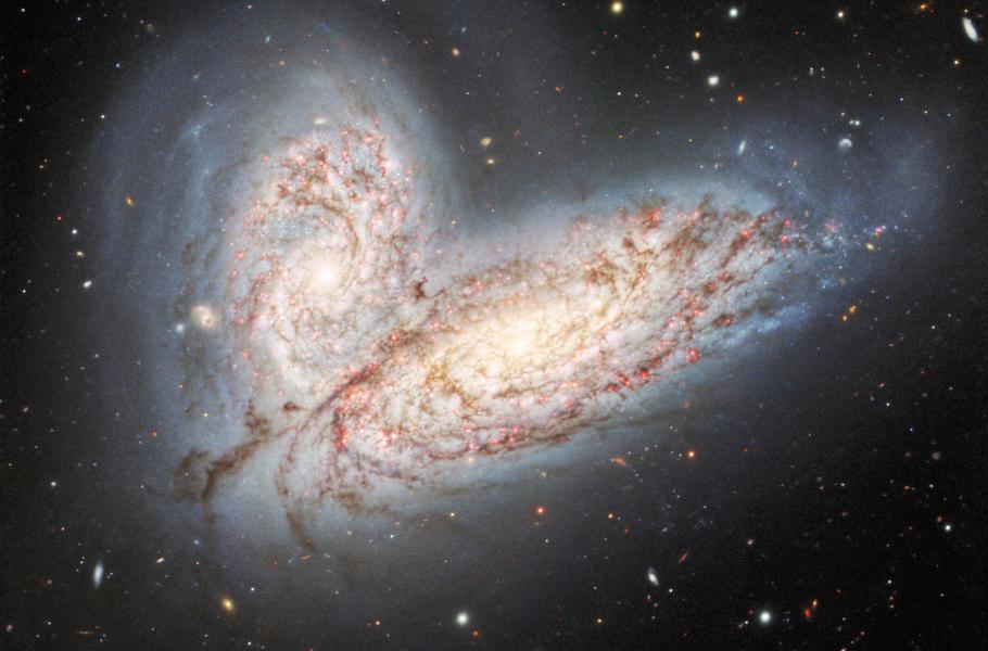Srážky galaxií mohou trvat miliony let – a NGC 5394 s NGC 5395 se právě nacházejí uprostřed takového osudového setkání. Od Země je dělí 160 milionů světelných roků a nejméně jednou se již potkaly. Jejich hvězdy od sebe leží tak daleko, že jsou jakékoliv jejich kolize nepravděpodobné. Srážka by však mohla vyvolat turbulentní pohyby v galaktických plynech a spustit nové epizody tvorby stálic. Na snímku z Gemini Observatory se hvězdotvorné oblasti jeví jako načervenalé shluky ve spirálních ramenech obou ostrovů. (foto: Wikimedia Commons, NOIRLab, CC BY 4.0)