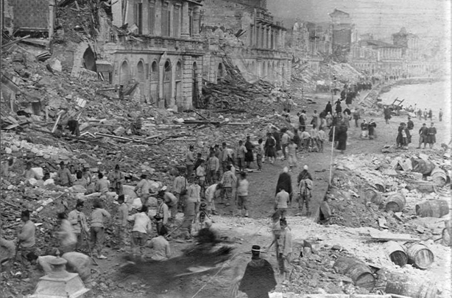 Největší přírodní katastrofa v dějinách starého kontinentu se udála 28. prosince 1908 na špičce italské „boty“, mezi severním pobřežím Sicílie a jižními břehy pevninské Kalábrie. Pnutí v tamní zlomové linii vyústilo v otřesy o síle 7,1 Richterovy stupnice, a to v hloubce okolo devíti kilometrů. Prakticky okamžitě se tak ocitla v troskách dvě protilehlá města Messina a Reggio Calabria, zatímco laviny kamení z okolních hor pohřbily řadu dalších přímořských obcí. Zemřely desítky tisíc lidí a zanikly jedny z nejstarších staveb v Evropě. (foto: Wikimedia Commons, Underwood, PDM 1.0)
