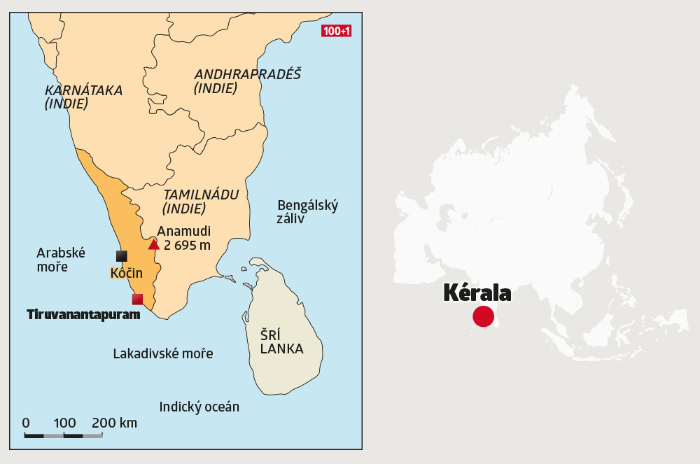Rozloha: 38 863 km², asi jako polovina ČR; charakter území: na východě drsný a skalnatý horský terén, západ spíš nížinatý, s příbřežními plantážemi; podnebí: vlhké tropické, ovlivněné sezonními monzuny; období dešťů nastává v letních měsících; min. noční / max. denní teploty (°C) v Tiruvanantapuramu: leden–březen 22/32, duben–červen 24/34, červenec–září 23/29, říjen až prosinec 22/32; nejnižší a nejvyšší bod: Indický oceán (0 m) / Anamudi (2 695 m).