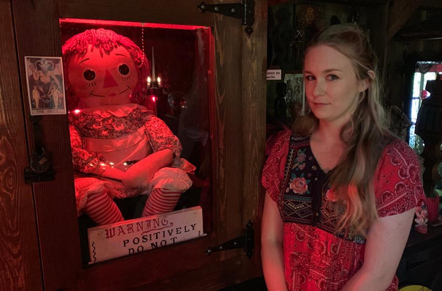 Údajně prokletá panenka Annabelle momentálně spočívá ve skladu uzavřeného muzea paranormálních vyšetřovatelů Eda a Lorraine Warrenových. Do jejich vlastnictví se dostala od dívky Donny, které hračku koupila matka ve starožitnictví. Annabelle se prý bez cizího přičinění pohybovala, přesouvala se mezi místnostmi, a dokonce za sebou zanechávala vzkazy. Podle nejdivočejších příběhů zabila jednoho člověka a sídlí v ní démon. Církev se ji pokusila očistit exorcismem, ale selhala. Není tedy divu, že o posedlé hračce vznikla řada hororových filmů. (foto: © The Warrens’ Occult Museum)