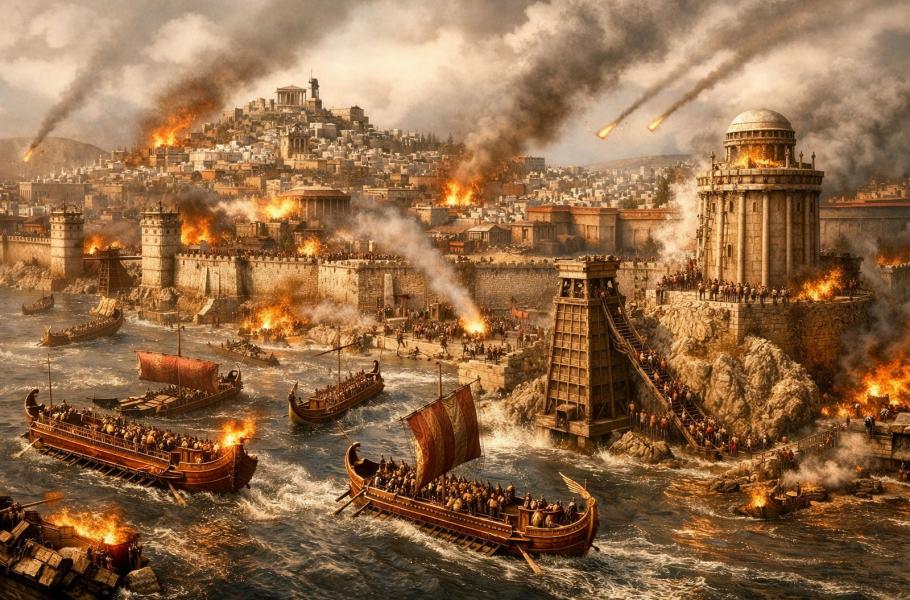 Římský námořní útok na Kartágo během třetí punské války (149-146 př. n. l.) (ilustrace: ChatGPT, PDM 1.0)
