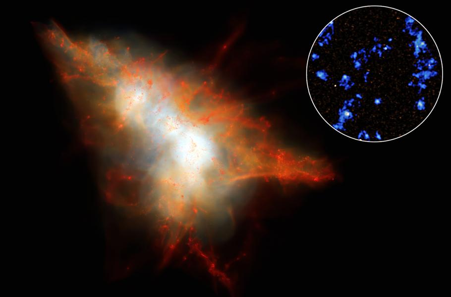 Snímek zachycuje záběr z kosmologické simulace objektu označovaného jako Lyman-alpha Blob. Ve výřezu mapa mezigalaktických plynových vláken (modrá barva) zachycených detektorem MUSE. Bílé body jsou oblasti intenzivní tvorby nových hvězd, do nichž dodávají materiál vlákna.